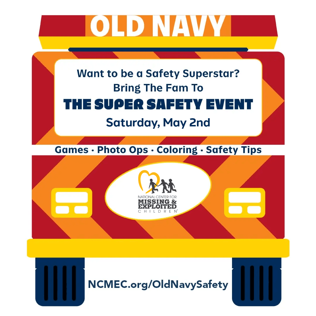 Join NCMEC staff and volunteers in-store at your local Old Navy on Saturday, May 2nd, where we will share vital safety resources, spark important conversations, and raise awareness about how to keep kids safe from harm.